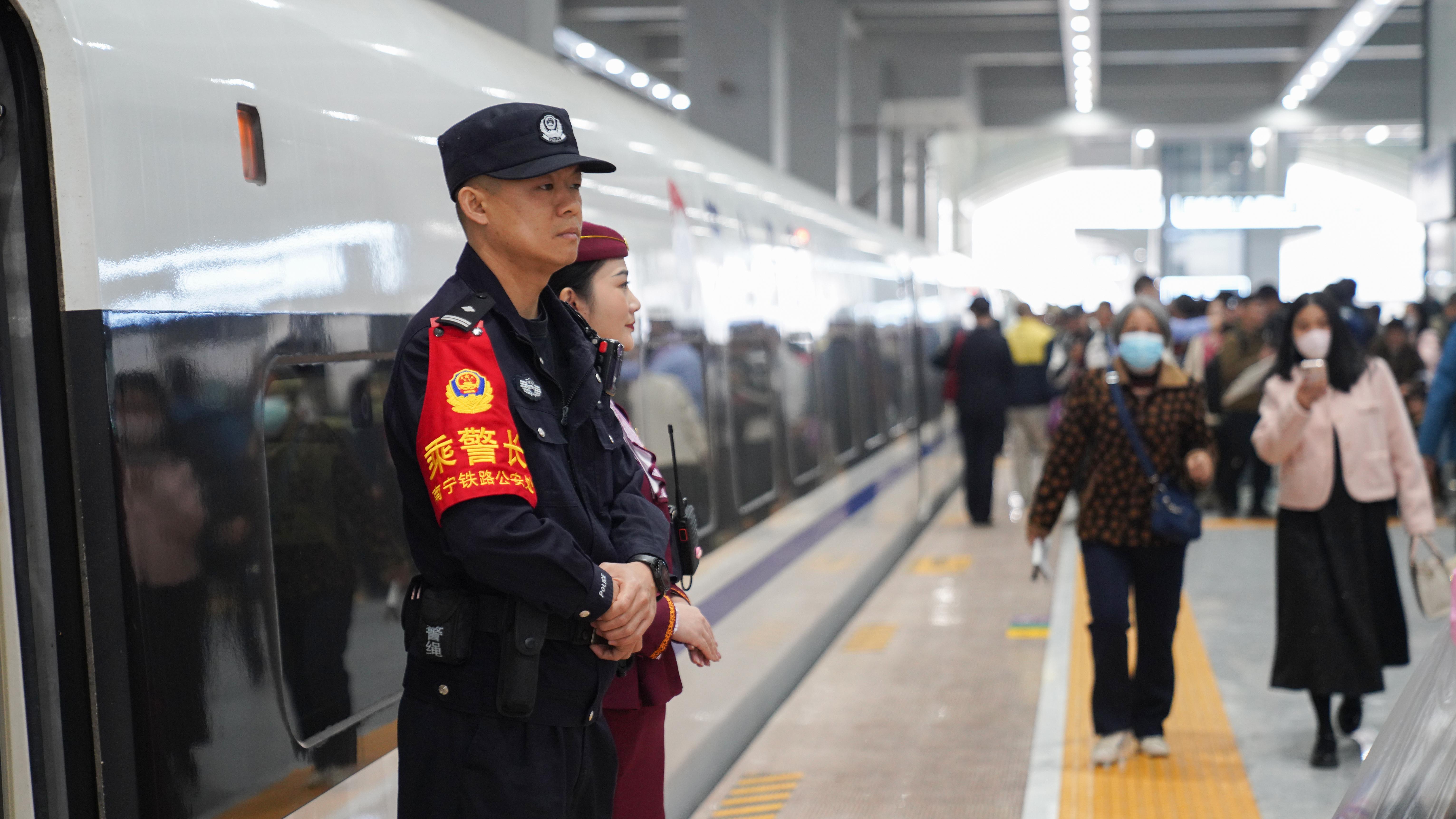 近日,南珠高鐵南寧至玉林段開通運(yùn)營。南寧鐵路公安局南寧公安處民警全力護(hù)航南珠高鐵平安運(yùn)行。圖為首發(fā)列車G5514次列車靠站,乘警在站臺(tái)維護(hù)秩序。