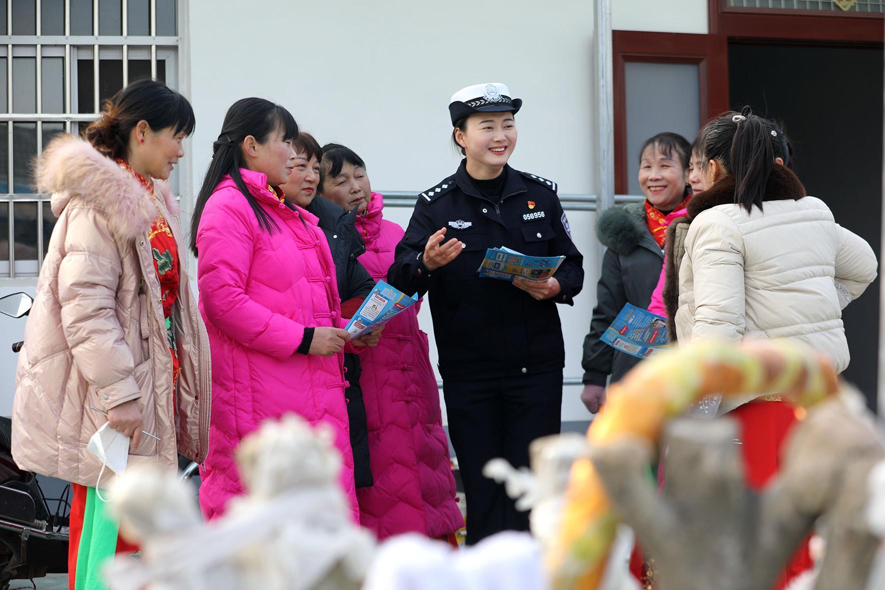 1月8日,安徽省舒城縣公安局交管大隊聯(lián)合柏林派出所民警走進柏林鄉(xiāng)官溝村文化廣場,通過發(fā)放宣傳資料、面對面交流的方式,向參與非遺“碟子舞”排練的村民宣傳交通安全知識。