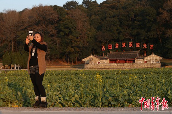 2014年2月24日,位于福建省上杭縣的古田會(huì)議會(huì)址前,一位女青年拍照留念。中青報(bào)·中青網(wǎng)記者 李建泉/攝