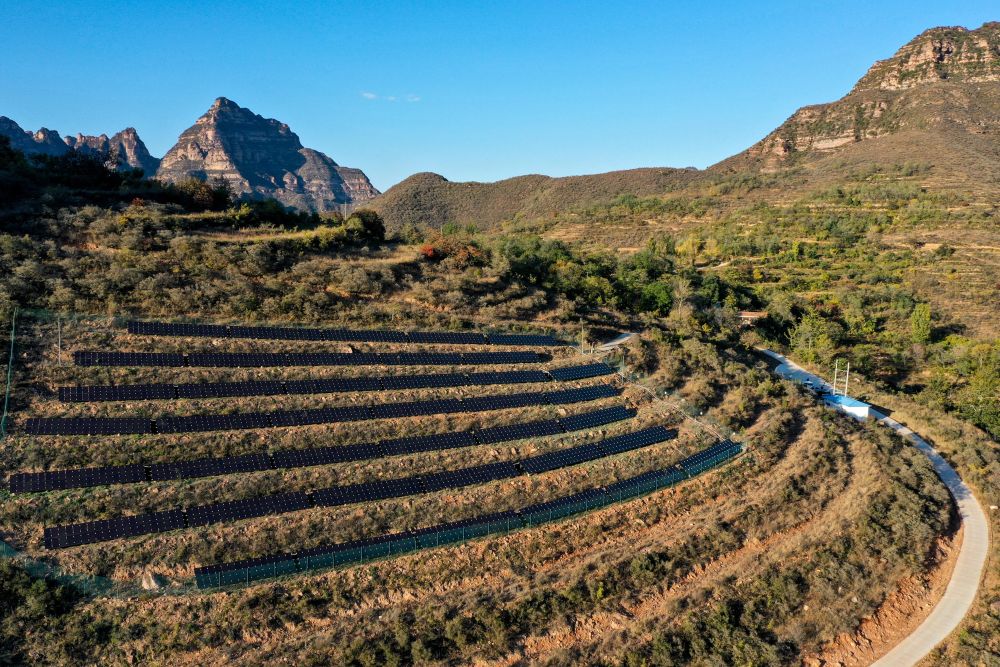 山西省左權(quán)縣麻田村的村級(jí)光伏電站。(無(wú)人機(jī)照片,新華社記者 曹陽(yáng)2020年10月16日攝)