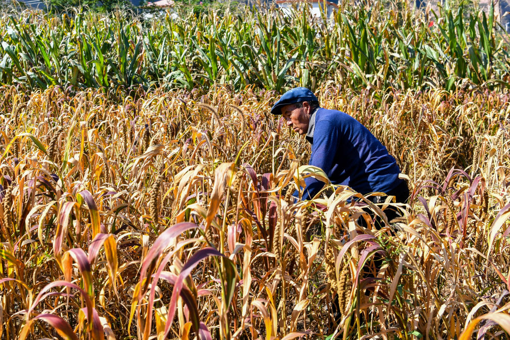 山西省左權(quán)縣麻田村的脫貧戶在收割谷子。(新華社記者 曹陽(yáng)2020年10月16日攝)