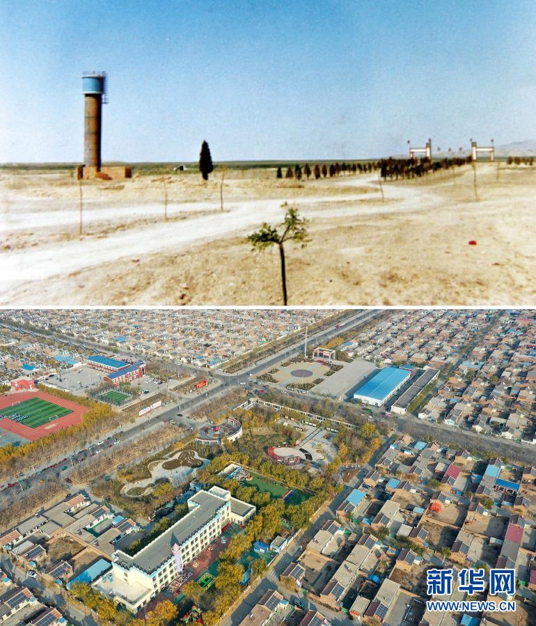 這是一張拼版照片。上圖為寧夏銀川市永寧縣閩寧鎮(zhèn)建設初期景象(資料照片);下圖為2020年11月11日拍攝的寧夏銀川市永寧縣閩寧鎮(zhèn)原隆村(無人機照片,新華社記者馮開華攝)。新華社發(fā)