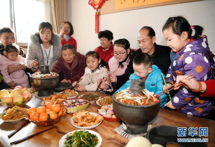 大年三十,在寧夏銀川市永寧縣閩寧鎮(zhèn)福寧村,謝興昌(右二)和家人一起吃團圓飯(2020年1月24日攝)。新華社記者 王鵬 攝