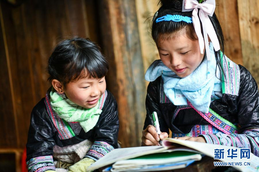 2月25日,貴州省從江縣丙妹鎮(zhèn)大歹小學的學生潘污簡(右)與堂妹在家里做寒假作業(yè)。新華社記者 楊文斌 攝