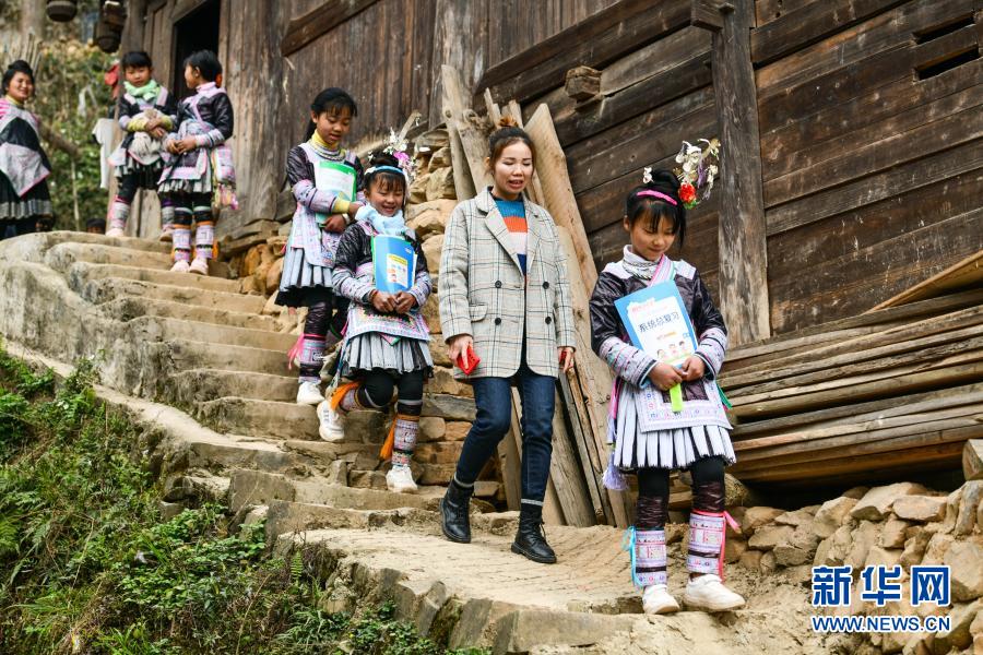 2月25日,在貴州省從江縣丙妹鎮(zhèn)大歹村,大歹小學的學生和老師蒙慧蓮(右二)在家訪途中。新華社記者 楊文斌 攝