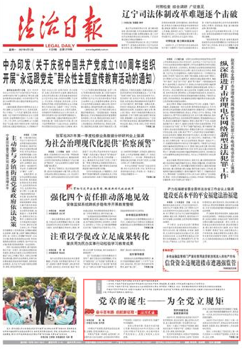 中國(guó)共產(chǎn)黨百年華誕之際,法治日?qǐng)?bào)4月12日起推出“奮斗百年路 啟航新征程·法治足跡”系列報(bào)道,追尋中國(guó)法治足跡,以激勵(lì)人們投身法治中國(guó)建設(shè)偉大工程,開(kāi)辟法治中國(guó)新紀(jì)元。敬請(qǐng)關(guān)注。