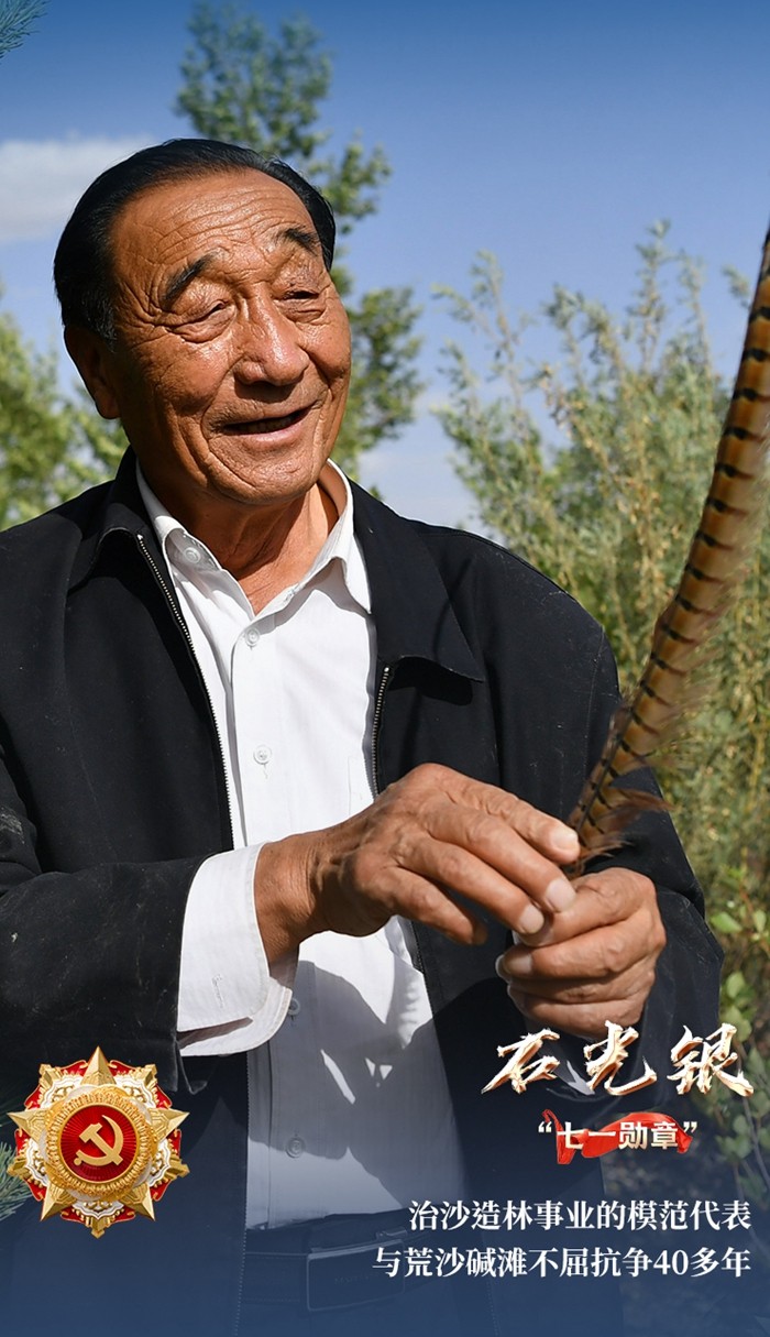 “石光銀,治沙造林事業(yè)的模范代表,40多年堅(jiān)持與荒沙堿灘不屈抗?fàn)?,?chuàng)造治沙與致富相結(jié)合的新模式,為徹底改變毛烏素沙漠南緣‘沙進(jìn)人退’惡劣環(huán)境作出杰出貢獻(xiàn)?!边@簡(jiǎn)短的出場(chǎng)介紹,讓更多的人記住了這副寬厚的肩膀扛起來(lái)的不凡事業(yè),也為“治沙人”的故事寫(xiě)下梗概。