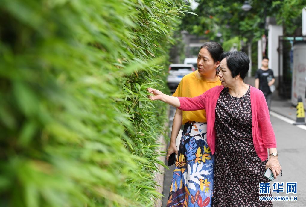 林丹(右)和軍門(mén)社區(qū)黨委副書(shū)記謝榕在社區(qū)檢查景觀綠植等工作(6月23日攝)。新華社記者 林善傳 攝