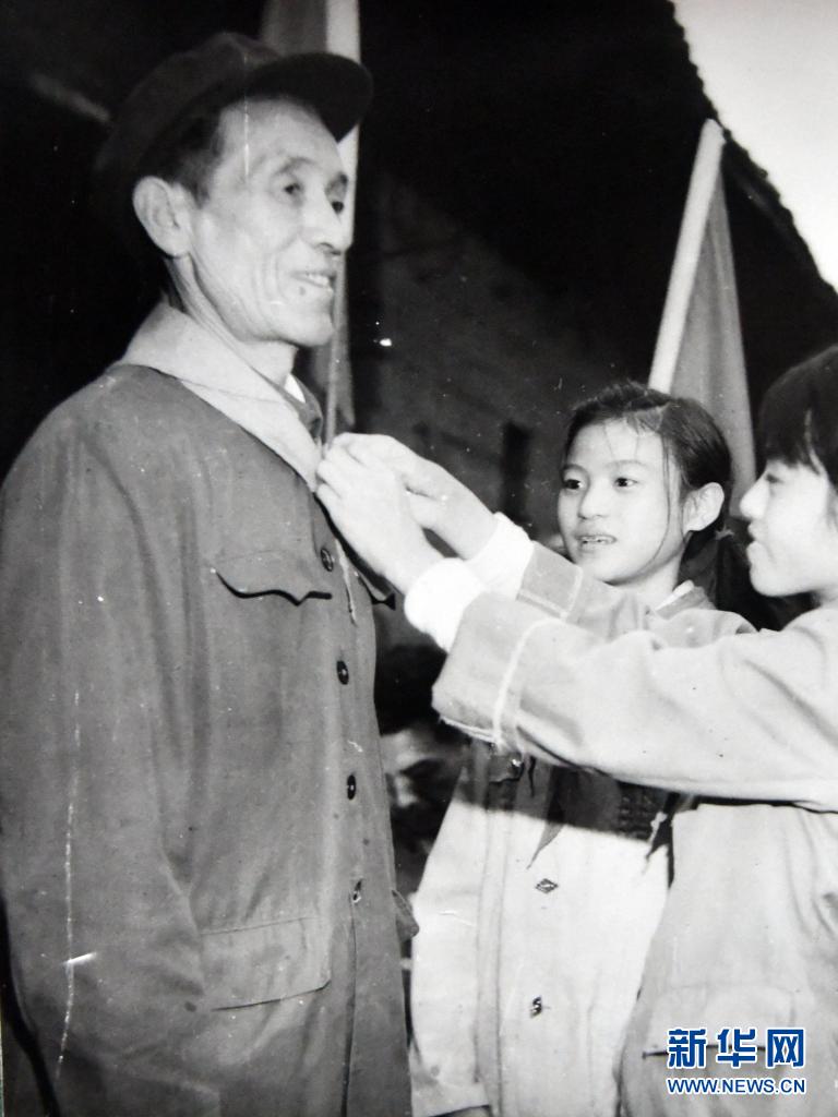 少先隊員為柴云振系紅領(lǐng)巾(資料照片)。新華社發(fā)