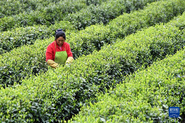 安徽金寨縣花石鄉(xiāng)大灣村的村民在茶產(chǎn)業(yè)扶貧基地里采茶(2020年4月17日攝)。新華社發(fā)
