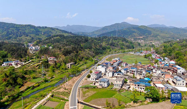 這是4月9日在新縣郭家河鄉(xiāng)拍攝的鄉(xiāng)村景色(無人機(jī)照片)。新華社發(fā)