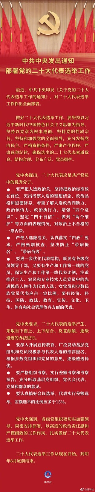 黨中央強調,各級黨組織要切實加強領導,周密安排部署,以高度的政治責任感和嚴謹細致的工作作風,扎實做好二十大代表選舉工作。要嚴肅政治紀律、組織紀律和選舉紀律,充分運用湖南衡陽、四川南充、遼寧等地拉票賄選、破壞選舉案件,開展警示教育,汲取教訓,引以為戒。加強對代表選舉工作的全程監(jiān)督,對違規(guī)違紀違法問題“零容忍”,一經發(fā)現堅決查處,確保風清氣正。要通過做好學習宣傳、組織動員、推薦提名、會議選舉、嚴肅紀律等各項工作,使代表選舉產生過程成為深入學習貫徹習近平新時代中國特色社會主義思想的過程,成為貫徹落實新時代黨的建設總要求和新時代黨的組織路線的過程,成為理想信念教育和黨性黨風黨紀黨史教育的過程,成為黨內政治生活生動實踐和民主集中制教育的過程,進一步增強黨的創(chuàng)造力、凝聚力、戰(zhàn)斗力,動員廣大黨員、干部更加緊密地團結在以習近平同志為核心的黨中央周圍,不忘初心、牢記使命,攻堅克難、開拓奮進,為全面建設社會主義現代化國家、奪取新時代中國特色社會主義偉大勝利、實現中華民族偉大復興的中國夢作出新的更大貢獻。