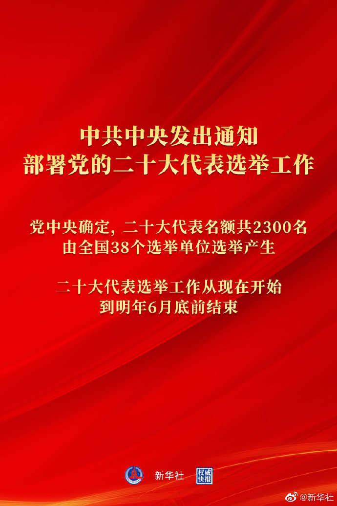 黨中央確定,二十大代表名額共2300名,由全國38個選舉單位選舉產生。做好二十大代表選舉工作,要堅持以習近平新時代中國特色社會主義思想為指導,堅持以黨章為根本遵循,堅持黨的性質宗旨,堅持和加強黨的全面領導,充分發(fā)揚黨內民主,嚴格資格條件,嚴密產生程序,嚴肅選舉紀律,確保選出的二十大代表素質優(yōu)良、結構合理、分布廣泛、黨員擁護。