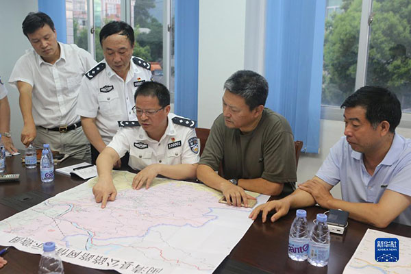 潘東升(中)在閩清指導(dǎo)防抗臺(tái)風(fēng)“尼伯特”(2016年7月12日攝)。新華社發(fā)(福州市公安局供圖)