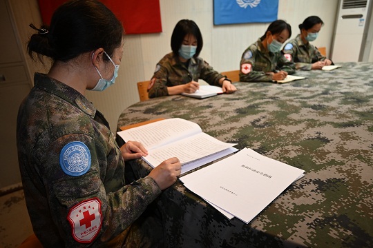 維和醫(yī)療分隊(duì)官兵學(xué)習(xí)法律法規(guī)和聯(lián)合國規(guī)范性文件。李曉龍 攝