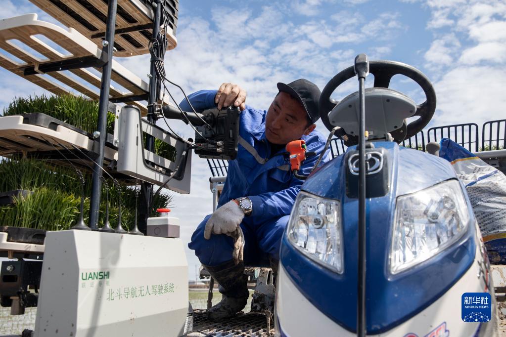 在北大荒集團紅衛(wèi)農(nóng)場有限公司智慧農(nóng)業(yè)先行示范區(qū)內(nèi),工作人員設(shè)置無人駕駛插秧機工作路徑(5月11日攝)。據(jù)介紹,無人駕駛智能插秧機應(yīng)用北斗衛(wèi)星定位系統(tǒng),田間作業(yè)時可實現(xiàn)自動避障、掉頭和轉(zhuǎn)彎。新華社記者 張濤 攝