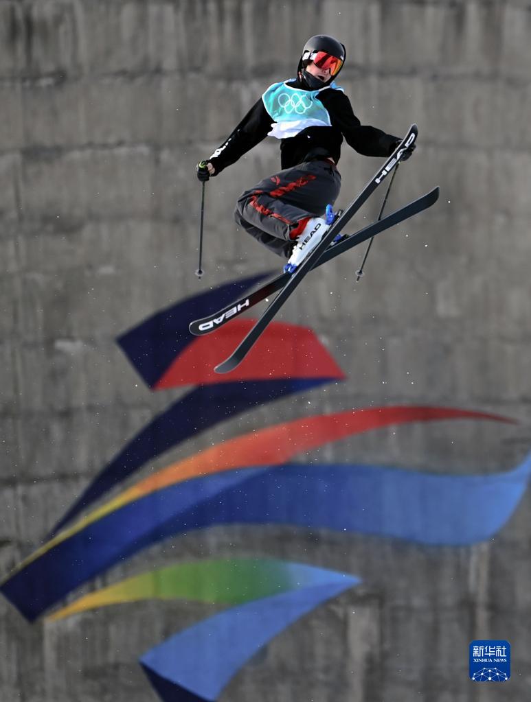 2月7日,中國選手何金博在北京2022年冬奧會自由式滑雪男子大跳臺資格賽中。新華社記者李賀攝