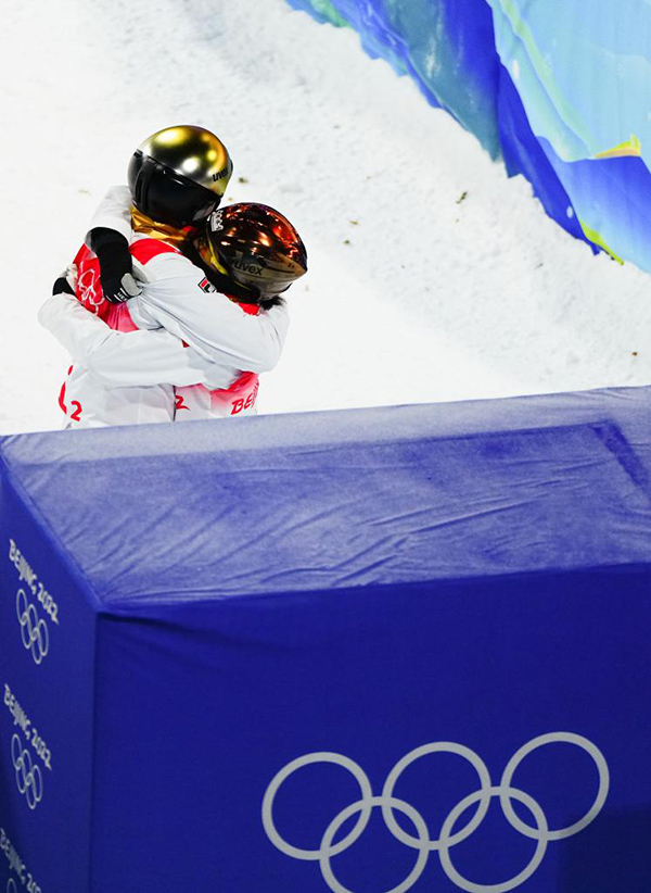 2月10日,中國隊(duì)選手徐夢桃(右)和賈宗洋在北京2022年冬奧會自由式滑雪空中技巧混合團(tuán)體決賽比賽后擁抱。新華社記者許暢攝