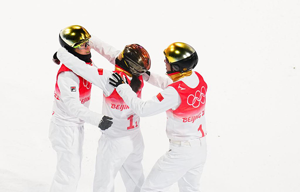 2月10日,中國隊(duì)選手徐夢桃(中)與隊(duì)友齊廣璞(左)、賈宗洋在北京冬奧會自由式滑雪空中技巧混合團(tuán)體決賽后。新華社記者許暢攝