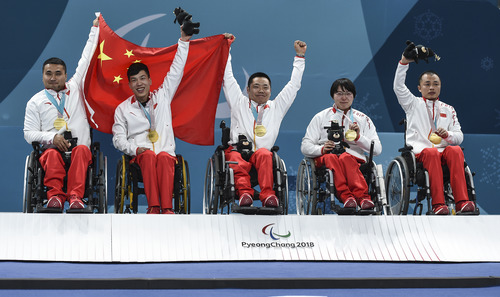 2018年3月17日,中國隊在平昌冬殘奧會輪椅冰壺比賽中獲得金牌。圖為隊員王海濤、陳建新、劉微、王蒙、張強(從左至右)在頒獎儀式上。新華社記者夏一方攝