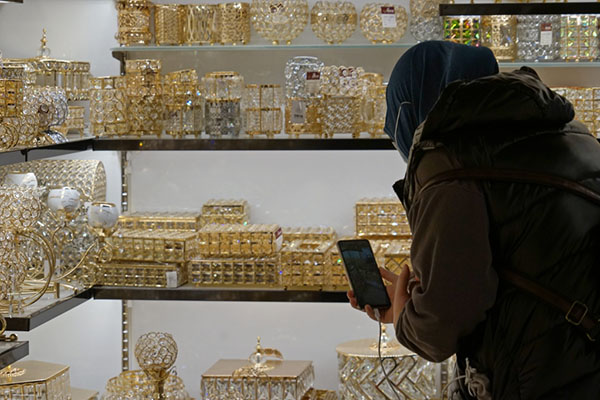 義烏國際商貿(mào)城一家水晶商鋪內(nèi),業(yè)務(wù)員小丁正在貨架前進行遠程視頻連線,手機的另一頭連著巴勒斯坦。受疫情影響,海外客商來華不便,遠程直播成為其采購之“眼睛”?!翱蛻魮倪@個燈臺尺寸比較大,運費會不會比較貴?”業(yè)務(wù)員小丁問。“沒問題,主體和燈座可以拆卸,包裝不占空間?!鄙啼佖撠熑藙s斌立即回復。