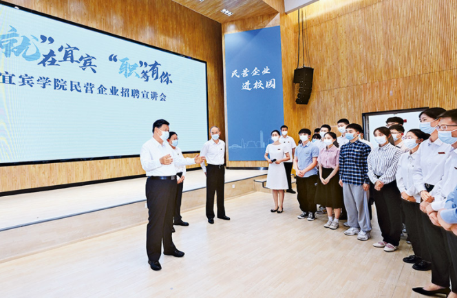 2022年6月8日,中共中央總書記、國家主席、中央軍委主席習近平在四川考察。這是8日下午,習近平在宜賓學院考察時,向正在參加企業(yè)招聘宣講會的教師、學生、企業(yè)負責人了解企業(yè)招工需求和畢業(yè)生簽約率等情況。 新華社記者 李學仁/攝
