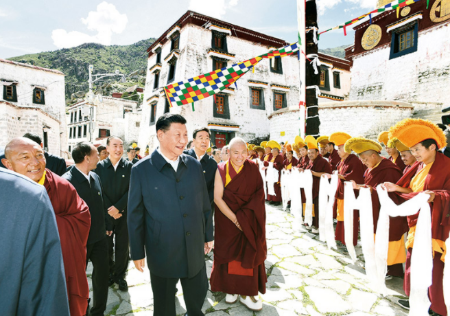 2021年7月21日至23日,中共中央總書記、國家主席、中央軍委主席習近平來到西藏,祝賀西藏和平解放70周年,看望慰問西藏各族干部群眾。這是22日下午,習近平在位于拉薩西郊的哲蚌寺考察。 新華社記者 謝環(huán)馳/攝