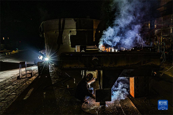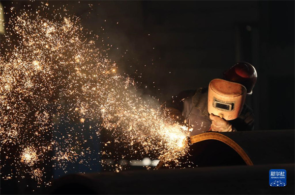 在沈陽北方重工集團有限公司,工人在車間焊接產(chǎn)品(2022年3月24日攝)。 新華社發(fā)