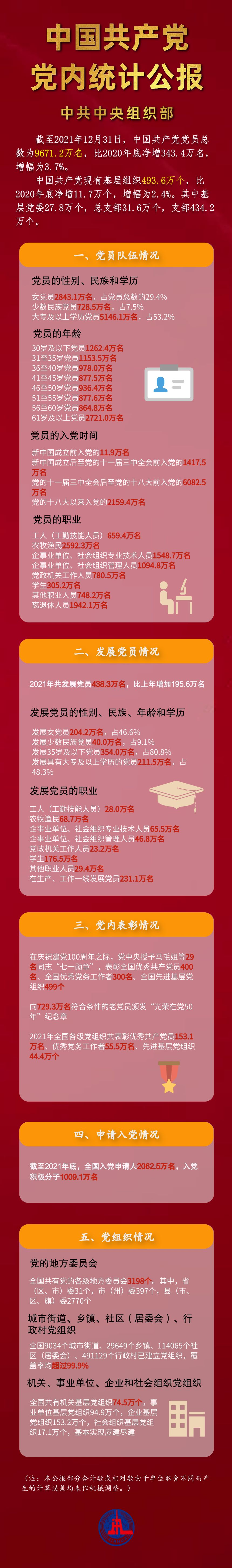 中央組織部最新黨內(nèi)統(tǒng)計(jì)數(shù)據(jù)顯示,截至2021年底,中國(guó)共產(chǎn)黨黨員總數(shù)為9671.2萬(wàn)名,比上年凈增343.4萬(wàn)名。黨的基層組織493.6萬(wàn)個(gè),比上年凈增11.7萬(wàn)個(gè)。中國(guó)共產(chǎn)黨一路走來(lái),始終把基層黨組織和黨員隊(duì)伍建設(shè)作為黨的建設(shè)的基礎(chǔ)性工作,不斷吸收新鮮血液,著力鍛造先鋒隊(duì)伍,使黨始終保持旺盛生命力和強(qiáng)大戰(zhàn)斗力。