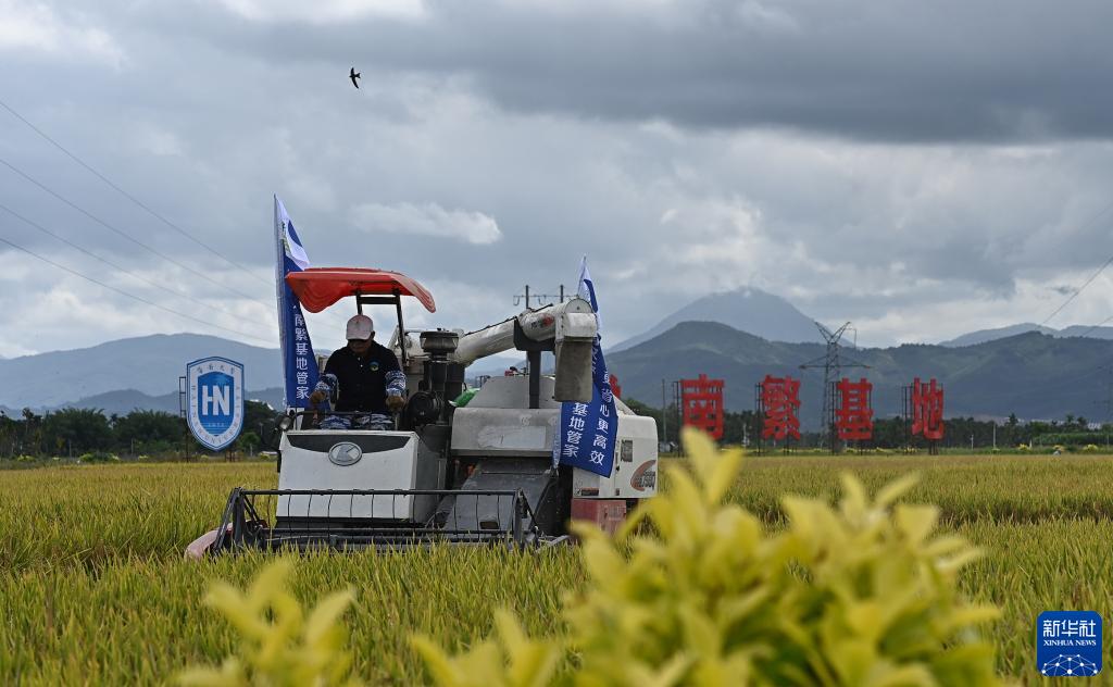 在三亞市崖州區(qū)(壩頭)南繁公共試驗基地試驗示范點(diǎn)稻田,工作人員操作收割機(jī)收割水稻(2022年5月6日攝)。新華社記者 楊冠宇 攝