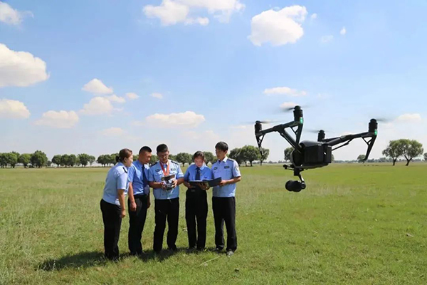 內(nèi)蒙古自治區(qū)鄂爾多斯市鄂托克前旗檢察院聚焦“馬蘭衛(wèi)士·綠色先鋒”公益訴訟品牌,全力打造鄂托克前旗生態(tài)保護(hù)檢察名片。圖為2020年8月,該院干警使用無(wú)人機(jī)巡查草原生態(tài)保護(hù)情況。 辛美娜 攝