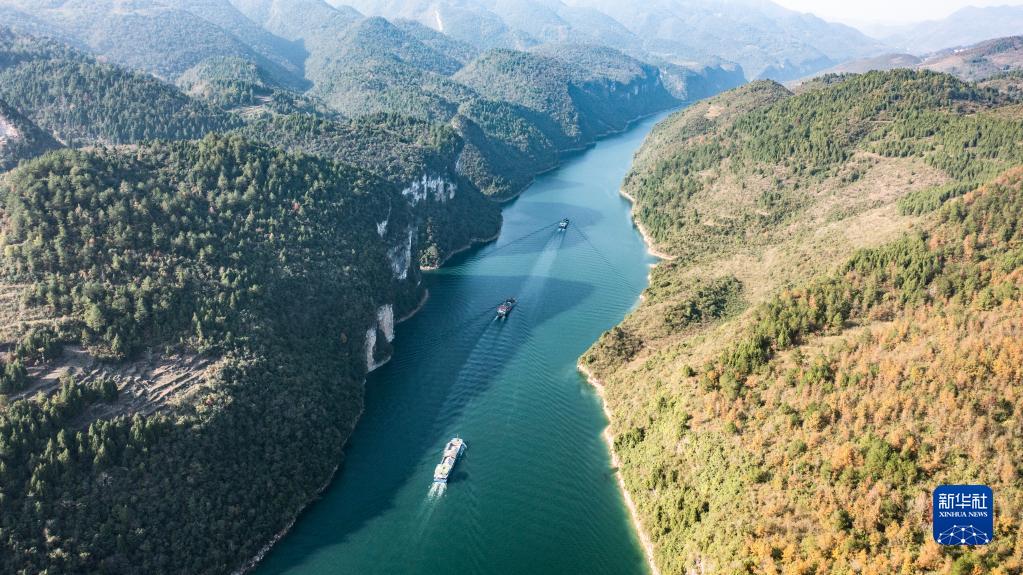 運(yùn)載磷礦石的貨船沿烏江航道順流航行(2021年11月18日攝,無(wú)人機(jī)照片)。 新華社記者 陶亮 攝
