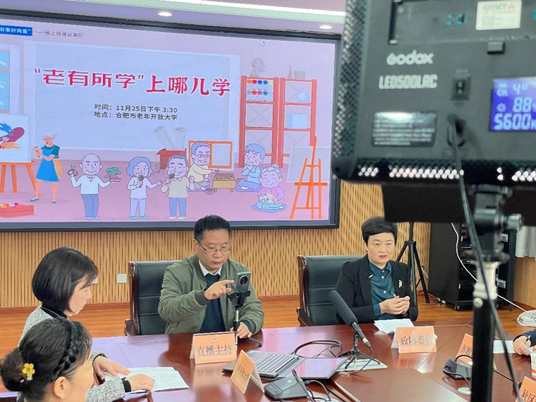 三臺攝像機、一個電子大屏、兩個補光燈……這是直播現(xiàn)場,也是線上協(xié)商議事廳。合肥老年開放大學內的會議室正在進行一場關于“‘老有所學’上哪兒學”的線上協(xié)商議事直播活動。