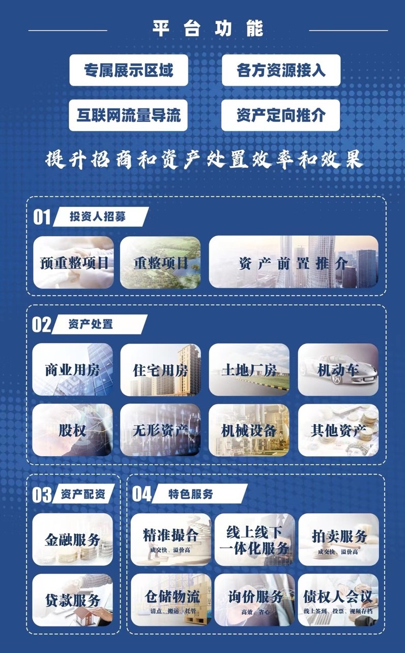 而在特色服務(wù)模塊,借助京東拍賣數(shù)字化、技術(shù)研發(fā)、線上流量、倉(cāng)儲(chǔ)物流、金融資源等優(yōu)勢(shì),該信息平臺(tái)還可為常州市破產(chǎn)企業(yè)提供精準(zhǔn)撮合、線上線下一體化服務(wù)、拍賣服務(wù)、詢價(jià)服務(wù)、倉(cāng)儲(chǔ)物流、債權(quán)人會(huì)議等一站式服務(wù),精準(zhǔn)篩選、深度匹配、定向觸達(dá)目標(biāo)用戶,以精準(zhǔn)推介的方式定期對(duì)常州優(yōu)質(zhì)項(xiàng)目進(jìn)行投資人定向引流,提升曝光度,為投資人尋找優(yōu)質(zhì)資產(chǎn),為處置方鎖定潛在買家,促進(jìn)資產(chǎn)處置和重整招商的成功率和溢價(jià)率,幫助法院及破產(chǎn)企業(yè)實(shí)現(xiàn)資產(chǎn)高效處置,以一系列優(yōu)質(zhì)服務(wù),助力資產(chǎn)處置提質(zhì)增效,為處置雙方保駕護(hù)航。